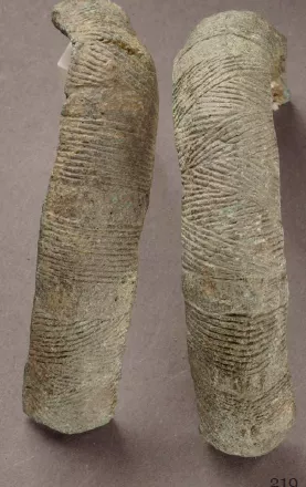de lignes incisées obliques qui forment des chevrons ; le décor du jonc est composé de trois bandes lisses séparées par deux groupes de douze à treize incisions suivies d’un panneau composé de lignes incisées obliques en forme de demi chevrons, et de lignes incisées formant chevrons entre lesquels s’intercalent des stries.