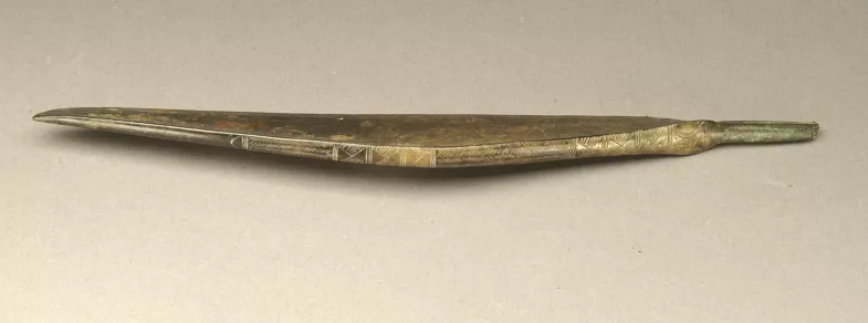 Couteau à soie simple ; le manche a disparu, il était certainement confectionné en matière organique (bois, os, corne) ; la soie de section cylindrique, se raccorde directement à la lame sans virole. La lame présente un élargissement du dos qui diminue vers la pointe ; le dos est richement décoré.