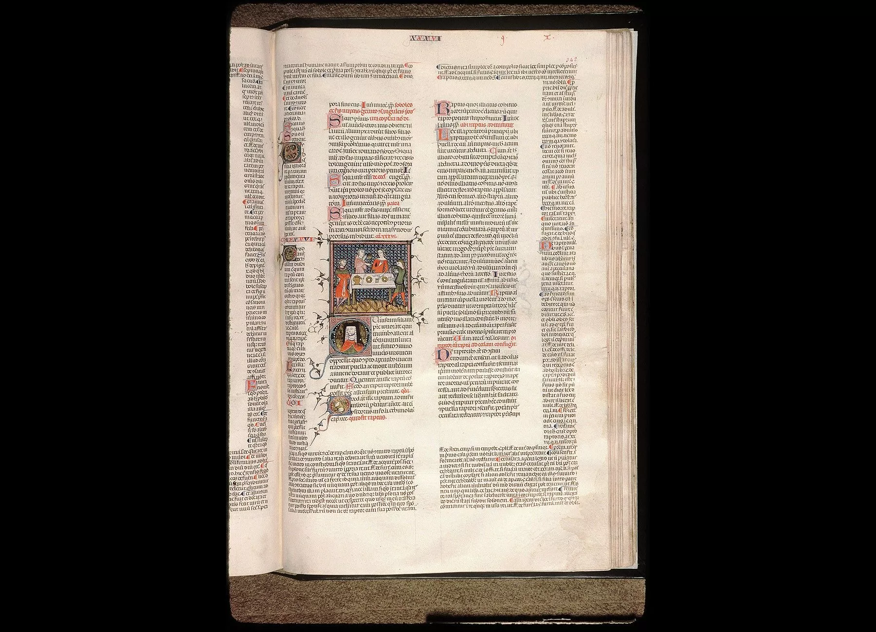 Commentaires de Labande. Commencement du XIVe siècle. Parchemin. 372 feuillets à 2 col.,chaque colonne entourée de la glose marginale. 462 à 299 millim.Au fol. 1 v°, armoiries de la donatrice, Madeleine Lartissuti, entourées d'une grande couronne de laurier et de fruits : écartelé, aux 1 et4 d'or, à six tourteaux mis en orle, celui qui est en chef d'azur,chargé de trois fleurs de lis d'or placées 2 et 1, les cinq autres de gueules; aux 2 et 3 d'or, bordé d'azur, au porc passant de sable. Fol. 2, formant en réalité la première page. Le texte du Décret est encadré de rinceaux sur fond d'or, avec figuration d'animaux; la séparation des deux colonnes est faite par des médaillons avec figures d'animaux sur fond d'or, et se poursuit dans toute la hauteur du feuillet pour s'épanouir en rinceaux au sommet; au commencement du texte, deux grandes miniatures figurant, l'une un docteur enseignant,l'autre un roi à qui un auteur offre son manuscrit; dans l'initiale,combat d'un Maure à cheval et d'un chrétien à pied; au bas du feuillet,miniature formant deux scènes séparées par les armoiries de Lartissuti. Initiale de chaque distinction miniaturée. Dès le fol. 88,commencement de la seconde partie du Décret, une miniature sur fond cloisonné d'or, de bleu et de rouge, forme l'en-tête de chaque cause, il y a donc 33 miniatures en tête des 33 premières causes,sauf celles des causes 24, 26 et 33 qui ont été découpées; puis(fol. 306), miniature en tête des canons pénitentiaux. Fol. 334 v°,335 v°, 342 et 343, miniatures en tête des causes 34, 35 et 36 et de la 3e partie du Décret. Lettres de couleur. Rel. bois recouvert de peau gaufrée et ornée de dessins variés, avec dos en basane; traces de quatre fermoirs en cuir. Cf. la description de ce manuscrit dans Schulte, Iter Gallicum, p. 398, n° LVI. (Célestins d'Avignon, 1 B 1.)