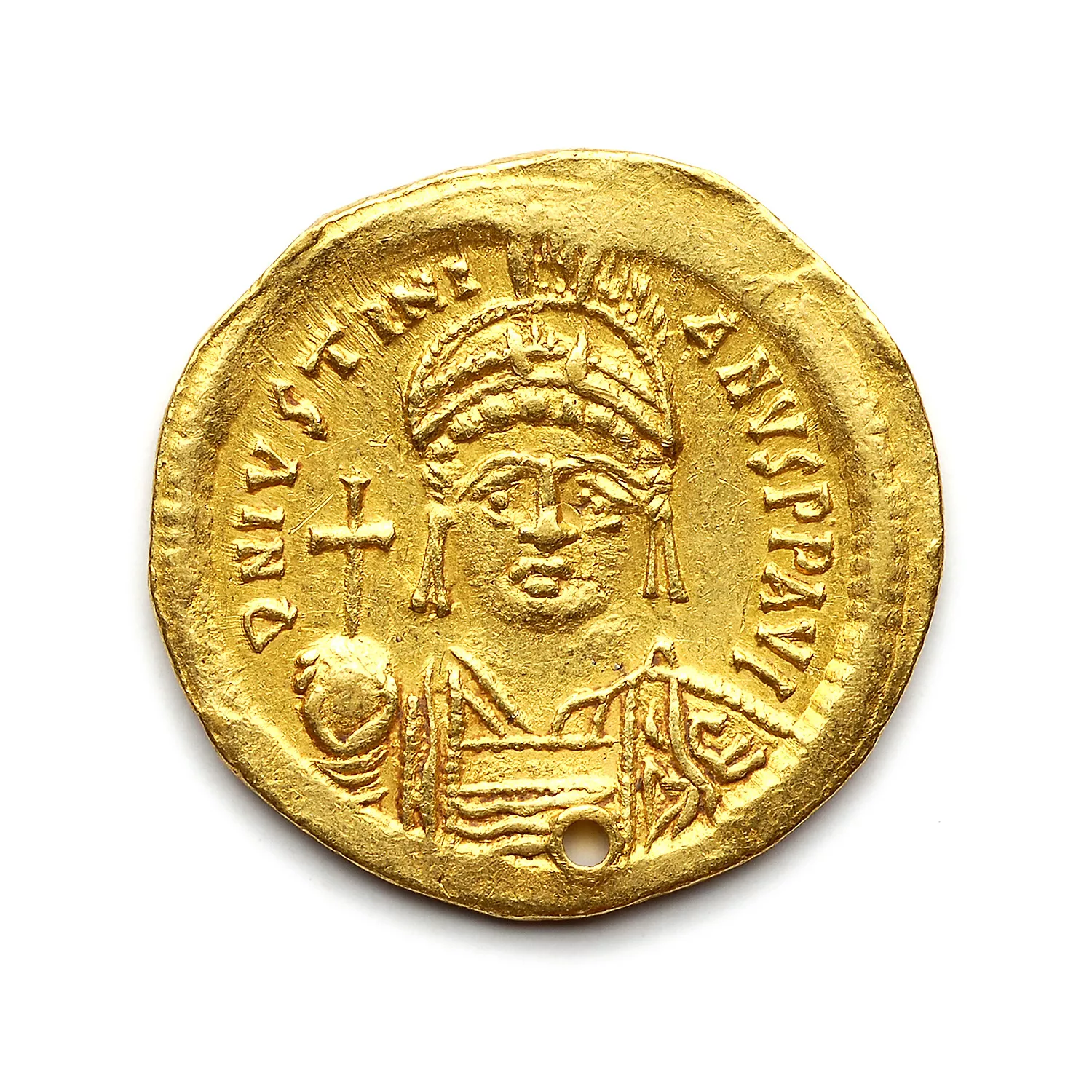 Victoire de face, allant à droite, tenant une couronne et un globe crucigère