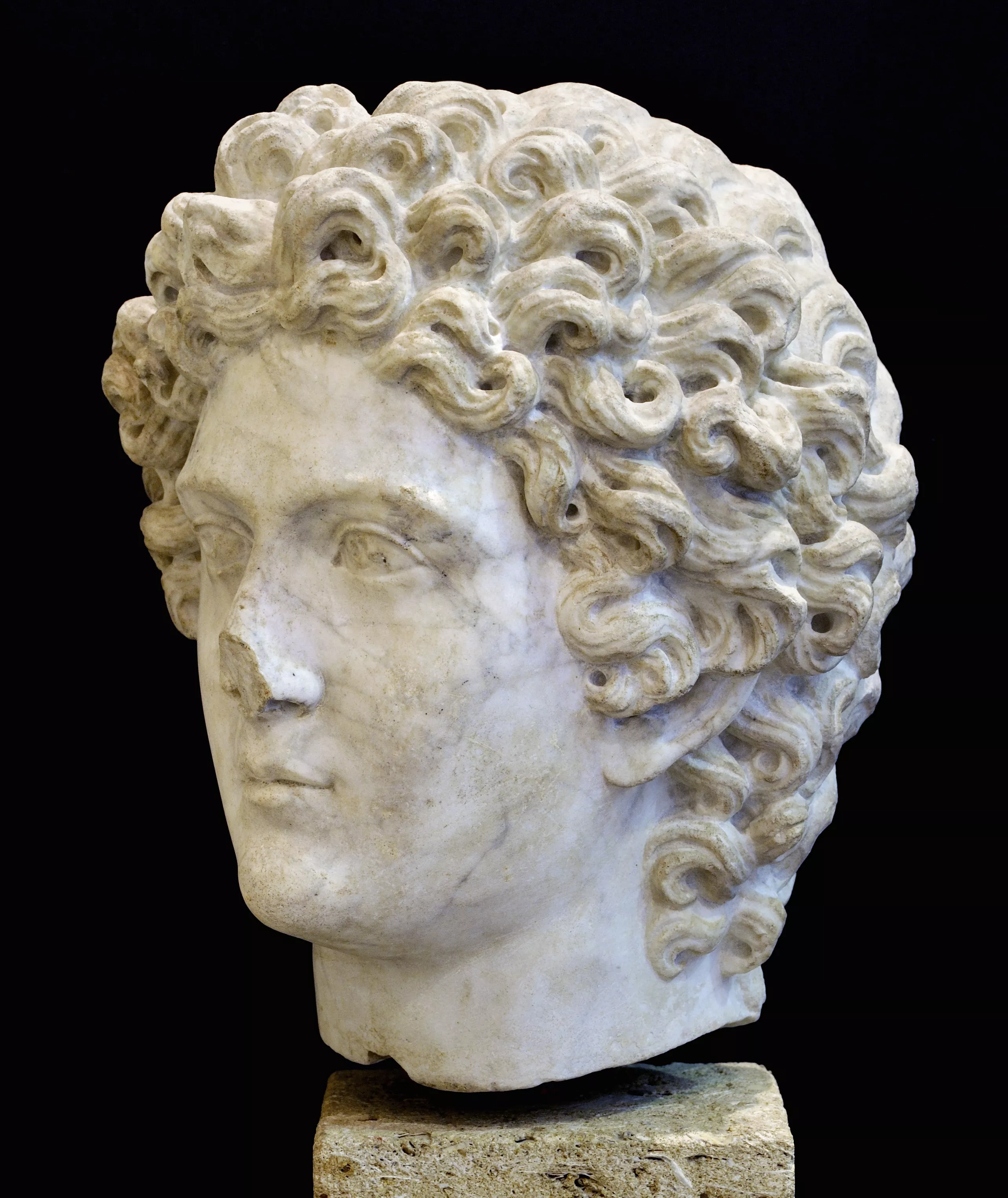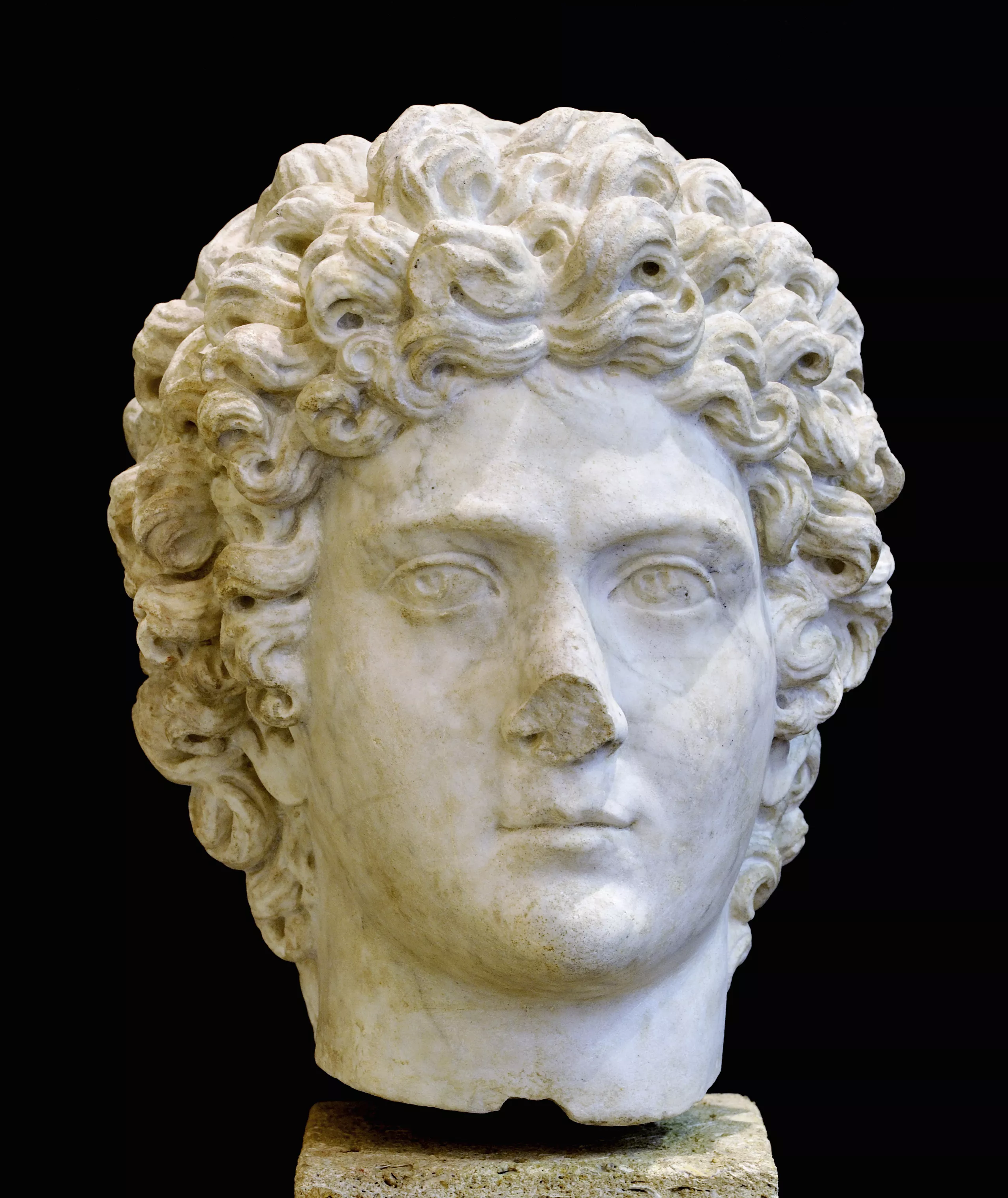 La coiffure évoque les représentations d'Hélios-Apollon.