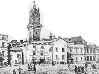 La maison communale et la Tour de l'Horloge au XVᵉ siècle.