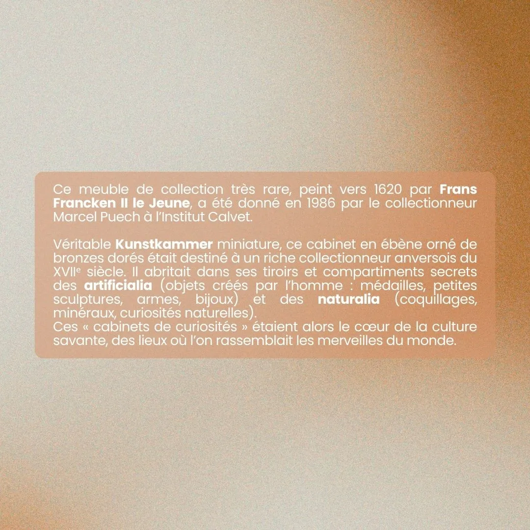 Ce meuble de collection très rare, peint vers 1620 par Frans Francken le Jeune, a été donné en 1986 par le collectionneur Marcel Puech à l’Institut Calvet.